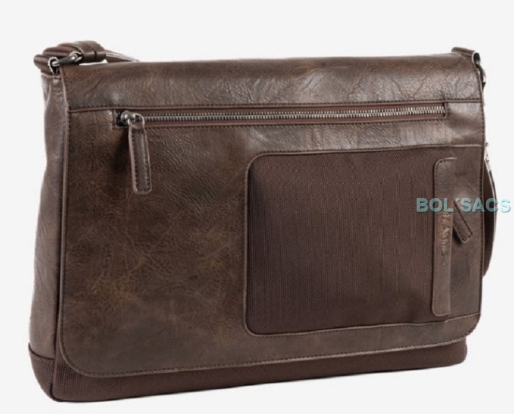 Portafolios fabricado en polipiel combinado con lona de alta calidad.Solapa con bolsillo grande y uno más pequeño con cierre de cremallera.