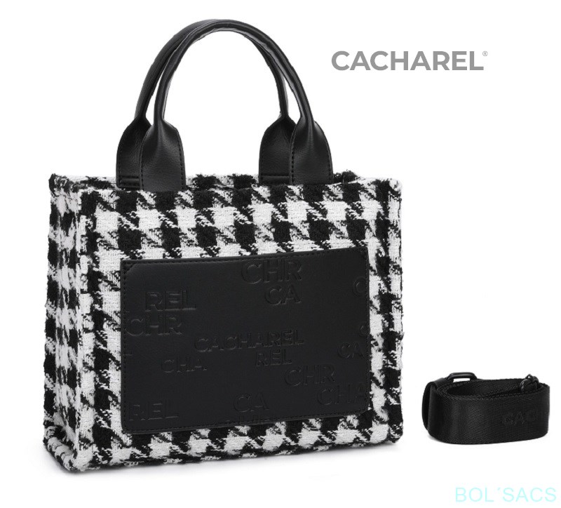Bolso con estampado pata de gallo y bolsillo delantero con grabado CACHAREL. Asa de mano y asa ajustable personalizada para llevar de bandolera o de hombro. Cierre principal con cremallera.